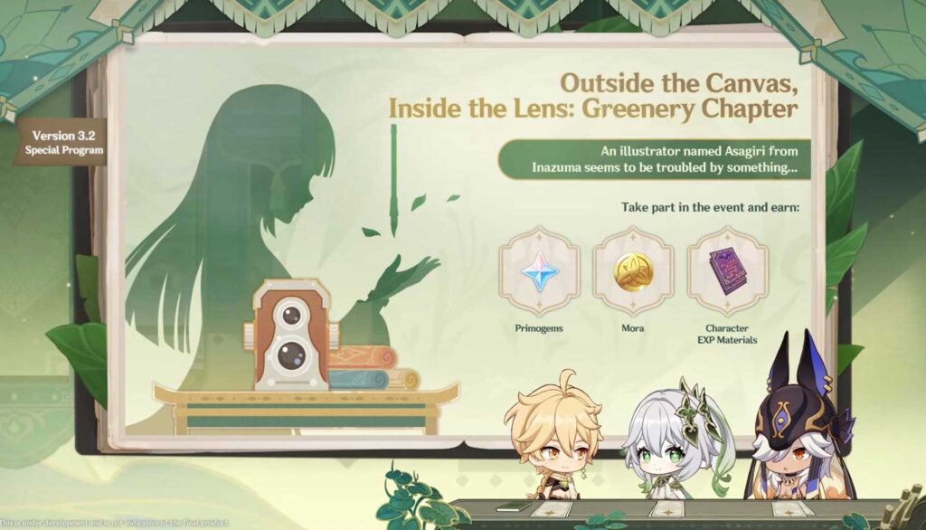 Por último tenemos un evento de fotografía, en el que ayudaremos a ilustrador de Inazuma a conseguir inspiración para su trabajo, para estas fotografías deberemos cumplir una serie de requisitos con cada fotografía para que sea valida.
