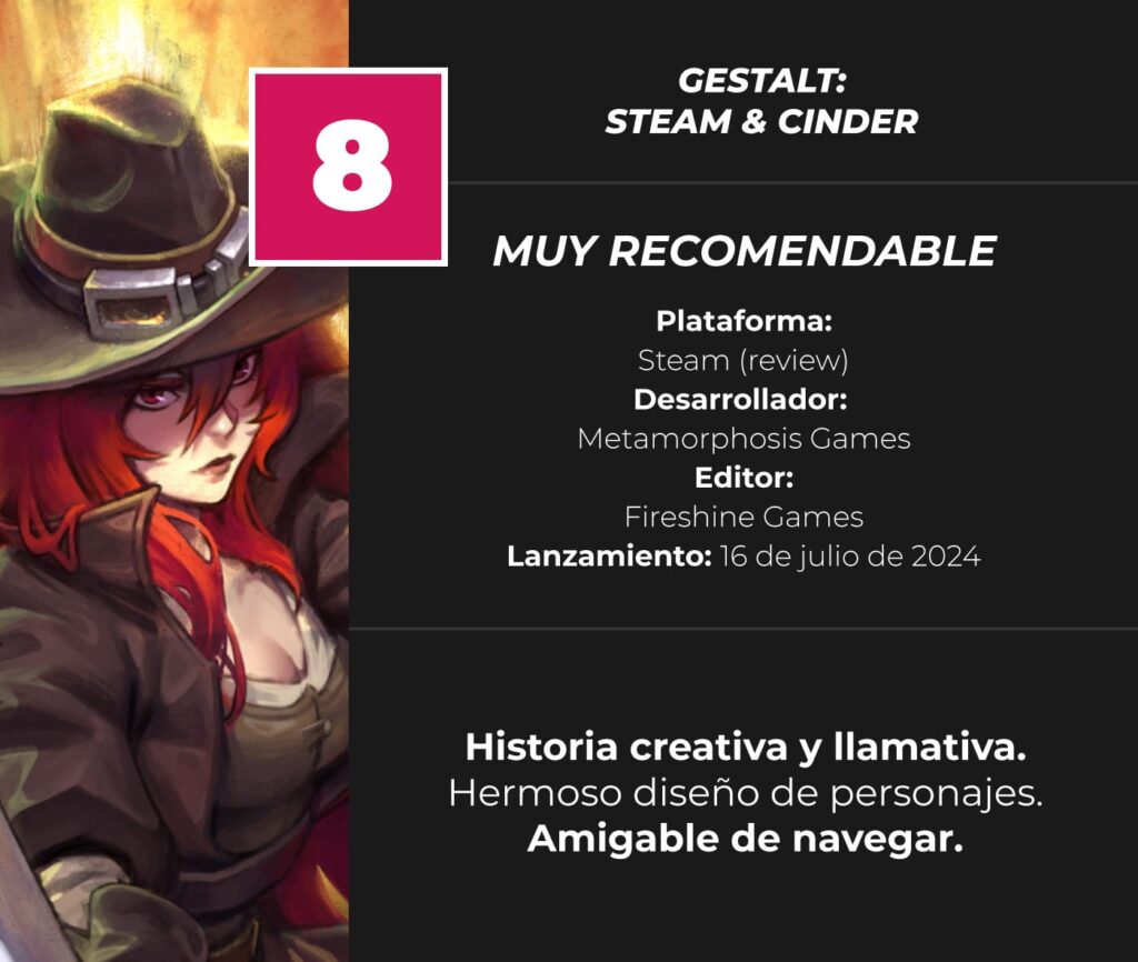 Esta review fue realizada en PC. Esta copia de Gestalt: Steam & Cinder fue proporcionada por Metamorphosis Games. Puedes consultar los criterios de puntuación aquí.