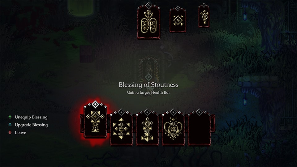 Para subir de nivel una bendición, el jugador requiere gastar 1 skill point en el primer nivel, 2 en el segundo y así sucesivamente hasta gastar 5 skill points para desbloquear el quinto nivel (el más alto). A lo largo del juego, uno podrá ir teniendo más de una bendición activa en todo momento, lo que facilita bastante nuestra aventura.