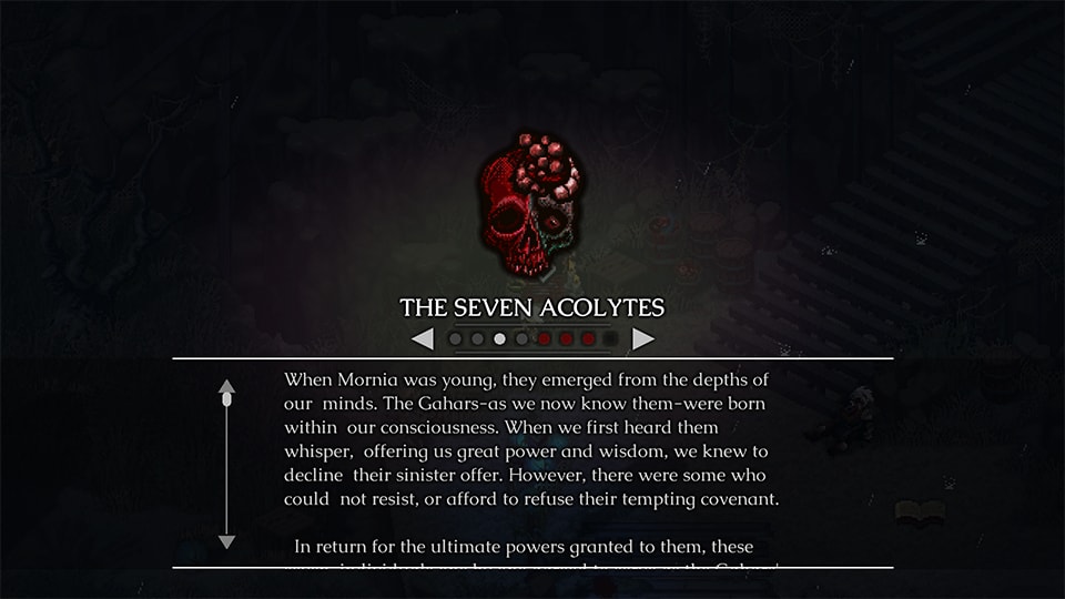 Como es costumbre en este estilo de juegos, la historia y narrativa pasa a un plano secundario, y requerirá de la lectura de documentos encontrados a lo largo de la aventura, esto también nos permitirá  encontrar algunas pistas sobre qué hacer o a donde ir, sin embargo, hacer esto no es para nada intuitivo y en nuestra experiencia, logra ser más frustrante para el usuario que una característica del juego. Esto a su vez puede provocar que la rica mitología del mundo que nos presenta Morbid: The Seven Acolytes, no sea disfrutada más que por aquellos jugadores que se dediquen a explorar y descifrar todos sus enigmas.
