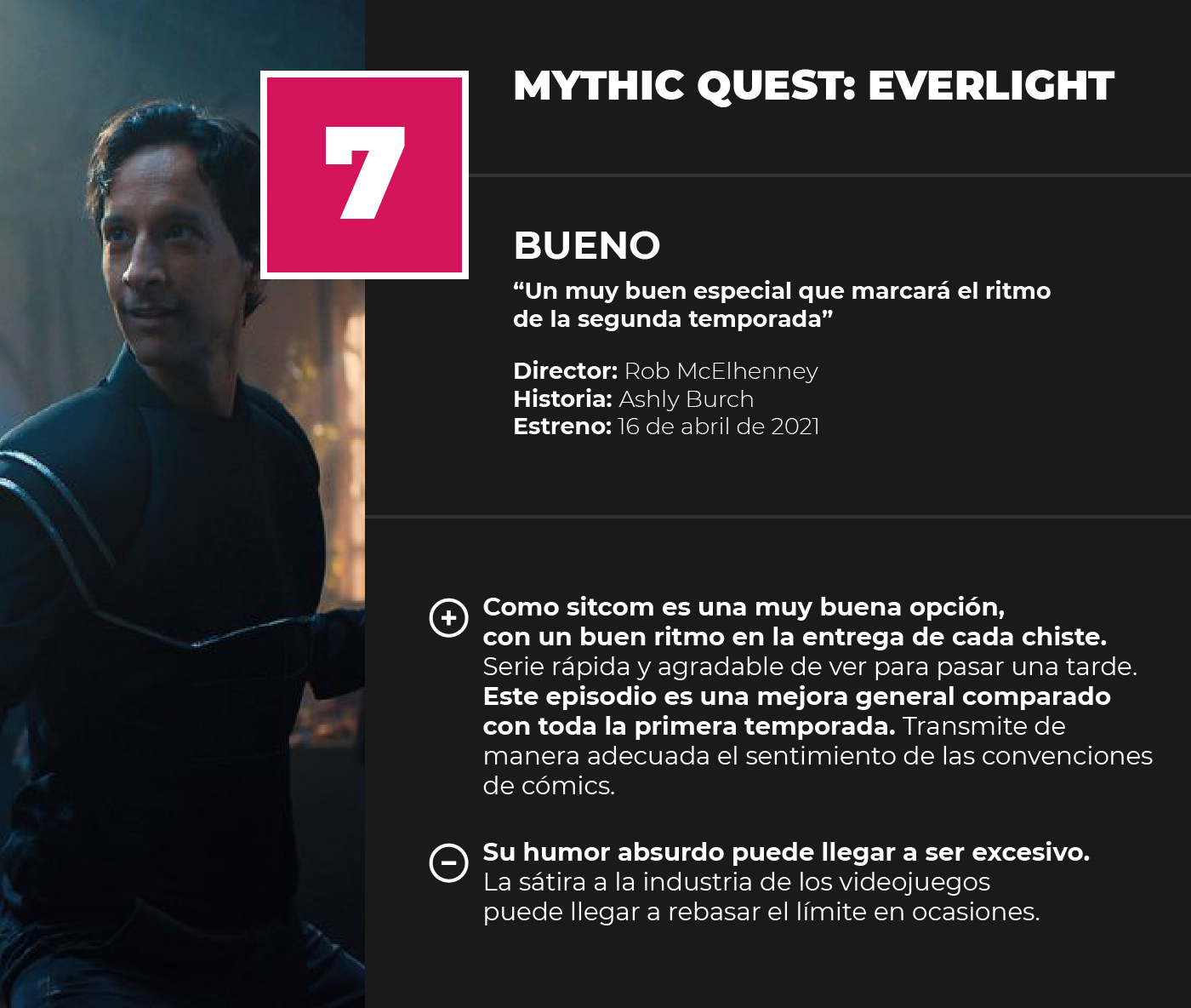 La historia de Mythic Quest se desarrolla bien y logra entretener. La serie es fácil de entender seas un fan de los videojuegos o no, y aunque quizás haya un par de referencias que no sean obvias, no es nada que arruine la experiencia. El mensaje está bien planteado y resulta agradable ver como el crecimiento de los personajes se mantiene en lugar de ser desechado de un capítulo a otro.
