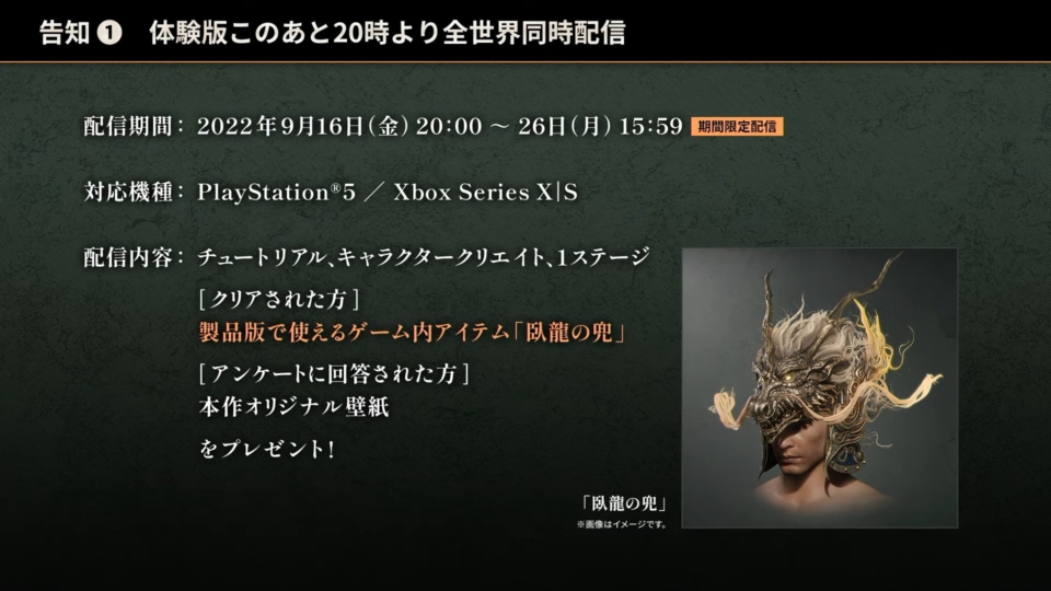 Si los jugadores logran terminar la demostración, recibirán el cosmético Crouching Dragon Helmet como recompensa, el cual podrá ser usado en el juego completo.