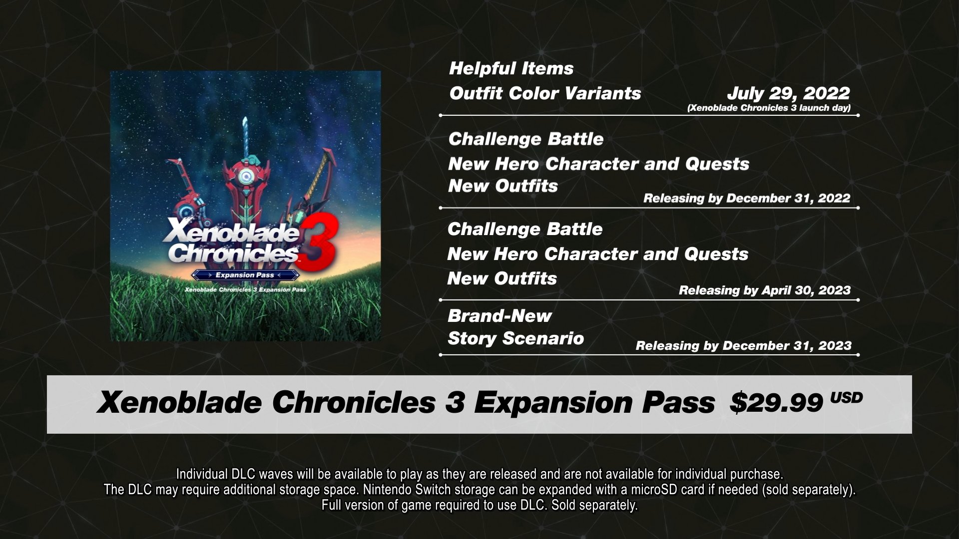 Por medio del directo enfocado en Xenoblade Chronicles 3, se ha confirmado que el título poseerá su propio pase de expansión que incluirá diferentes tipos de DLC.
